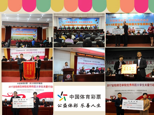 河南省體育彩票管理中心自2013年開始,已經(jīng)連續(xù)五年通過國家體育總局體育彩票管理中心與中國扶貧基金會合作,以“中國體育彩票·新長城助學(xué)基金”形式,向信陽師范學(xué)院、河南師范大學(xué)、許昌學(xué)院、商丘師范學(xué)院、周口師范學(xué)院、洛陽師范學(xué)院、安陽師范學(xué)院共計7所院校的400名優(yōu)秀貧困大學(xué)生累計捐助助學(xué)金200萬元。2015年,河南體彩中心在前兩年每年捐助50名貧困大學(xué)生的基礎(chǔ)上,將受助名額增加到了60名,2016年開始又將捐贈學(xué)校從一所增加到兩所,受助學(xué)生名額從60名又增加到120名,每個學(xué)生的受助金額從4000元提高到了5000元,希望幫助更多的困難學(xué)生及其家庭減輕經(jīng)濟(jì)負(fù)擔(dān)和精神壓力。