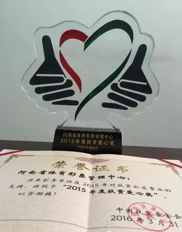 河南省體育彩票管理中心榮獲中國扶貧基金會“2017年度扶貧突出貢獻(xiàn)獎”,中心黨支部書記王海新代表單位領(lǐng)取了獎杯和證書。
