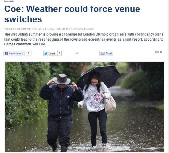 新浪體育訊 今年6月的降雨量已達(dá)英國同期天氣之最,而根據(jù)英國氣象系統(tǒng)的數(shù)據(jù)預(yù)測英國的降雨還將繼續(xù),這屆奧運(yùn)會(huì)很可能將成為史上遭遇降雨最多的一屆。