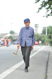 9月7日,記者見到了今年剛滿百歲的老人楊松云,他是彭山區(qū)青龍鎮(zhèn)有名的棉花匠。但除了彈棉花外,如今他還有一個(gè)習(xí)慣在當(dāng)?shù)爻隽嗣褪窍矚g長時(shí)間徒步,每天至少五公里,除了吃飯、睡覺、喝茶,都在外面逛街,青龍鎮(zhèn)的大街小巷都被他逛遍了。