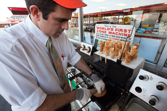 諾??耸械亩宫敱ち璧?Doumar's)因艾比?豆瑪在1904年的圣路易斯世界展覽會上發(fā)明了美國第一支蛋卷冰激凌而聞名于世。嘗一下百年蛋卷機做出來的冰激凌,還是那古老而甜蜜的味道。