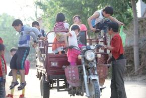 三輪摩托車開進鄭開大道南邊的一個村子停了下來。此時,我才發(fā)現(xiàn)真正在駕駛?cè)喣ν熊嚨氖且晃恢心陭D女,那個貌似在開車的小女孩就坐在三輪摩托車的油箱上。為了看清道路,中年婦女不得不歪著腦袋開車。車子停下時,車上的孩子們紛紛跳下車向家中跑去。