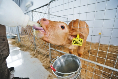 技術(shù)員呂博說,小牛犢們也是一日三餐,每次喂2公斤奶粉外,還加些犢牛顆粒飼料和干草。預(yù)計3個月大后,將逐步給它們斷奶。