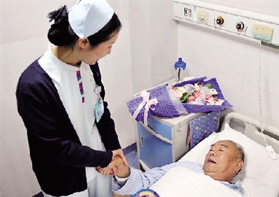 被救老人感激地拉著護(hù)士馬丹的手