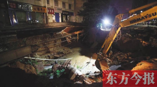 昨日21:26許,現(xiàn)場(chǎng)調(diào)來(lái)一輛挖土機(jī),開始路面開挖施救。據(jù)市政部門介紹,塌方約600平方米,長(zhǎng)約30米、寬約20米,深四五米。