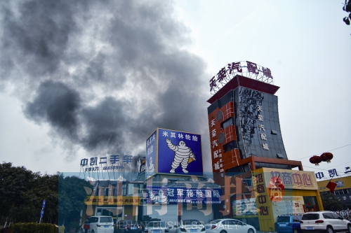 24日下午2時(shí),鄭州花園路與三全路交叉口附近的天榮汽配城里濃煙滾滾。