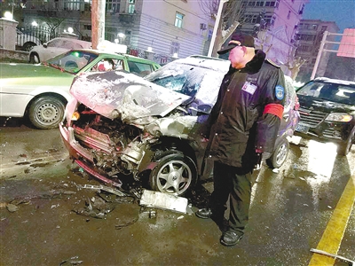 日暮雪大,路上結(jié)冰,一輛雪鐵龍由北向南行駛,撞上兩輛汽車(chē)與一輛公交車(chē),雪鐵龍轎車(chē)司機(jī)滿(mǎn)身酒氣,被警方帶去醫(yī)院抽血取證。圍觀市民看到路口被堵,紛紛譴責(zé)這名涉嫌酒駕的司機(jī):明知雪天路難走,還違法駕駛,真是不應(yīng)該。