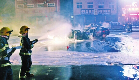 事故現(xiàn)場,消防員對起火車輛進行撲救。