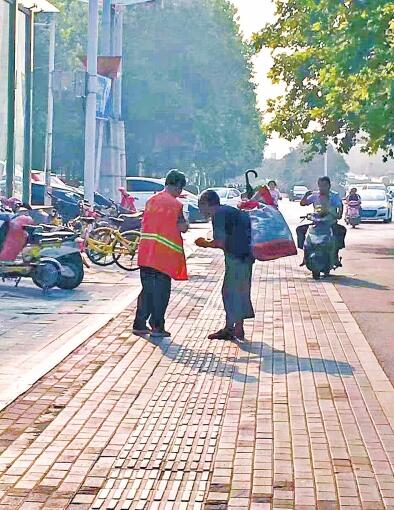 發(fā)生在鄭州金水路街頭的這一幕,剛好被市民拍到。昨日在網(wǎng)絡(luò)上發(fā)布后,感動(dòng)了很多網(wǎng)友。62歲的女環(huán)衛(wèi)工事后說(shuō):“這是應(yīng)該的,是小事,不值得宣傳?!备浇熳R(shí)她的人說(shuō),這名環(huán)衛(wèi)工是個(gè)熱心腸,之前已經(jīng)多次給流浪人員買飯、送水、送餐。