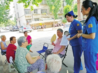 梁書(shū)珍、高嚴(yán)俯下身子給老人介紹,家庭醫(yī)生是國(guó)家推行的一項(xiàng)重要醫(yī)改,其宗旨是讓大家不出社區(qū),通過(guò)社區(qū)衛(wèi)生服務(wù)中心治療,把一些常見(jiàn)疾病控制住,減輕居民經(jīng)濟(jì)負(fù)擔(dān)。