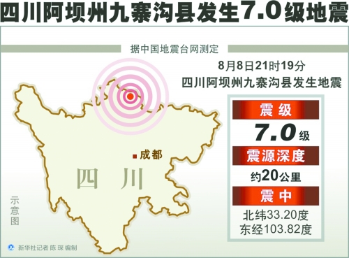 8月8日21時19分49秒,阿壩州九寨溝縣(東經(jīng)103.82度、北緯33.20度)發(fā)生7.0級地震,震源深度約20公里。