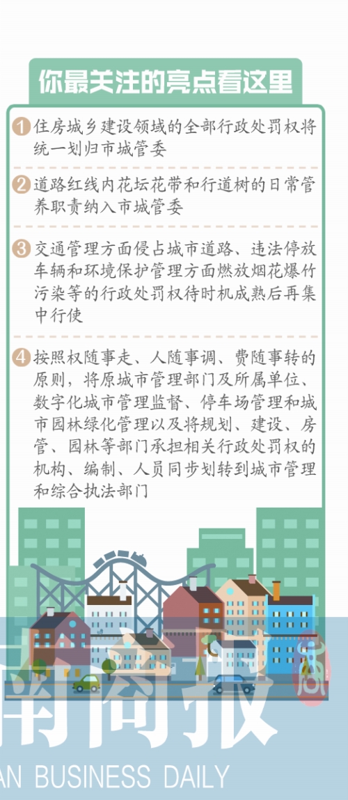 按照權(quán)隨事走、人隨事調(diào)、費隨事轉(zhuǎn)的原則,將原城市管理部門及所屬單位、數(shù)字化城市管理監(jiān)督、停車場管理和城市園林綠化管理涉及的機構(gòu)、編制、人員同步劃轉(zhuǎn)到城市管理和綜合執(zhí)法部門;將規(guī)劃、建設、房管、園林等部門承擔相關(guān)行政處罰權(quán)的機構(gòu)、編制、人員同步劃轉(zhuǎn)到城市管理和綜合執(zhí)法部門。