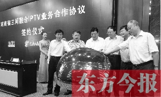 省委副書記、省長謝伏瞻發(fā)來賀信,向河南IPTV業(yè)務三方合作協(xié)議成功簽署表示熱烈祝賀。副省長張廣智,省委宣傳部副部長、省廣電局局長趙景春,省委宣傳部副部長、河南日報報業(yè)集團董事長、社長朱夏炎,省工信廳廳長王照平,省通信管理局局長宋靈恩,中國網(wǎng)絡電視臺總經(jīng)理、愛上電視傳媒有限公司董事長汪文斌,河南電視臺臺長王少春共同出席了簽約儀式,宣告河南IPTV業(yè)務正式啟動。