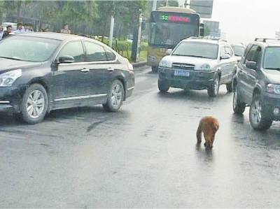 記者隨后致電鄭州市林業(yè)局野生動物救護(hù)站求助。在等待的過程中,這只“美猴王”引來不少市民圍觀,有市民拿出手機(jī)靠近拍照,“美猴王”猛地躥出,嚇得拍照的市民連退幾步。見人群漸多,“美猴王”坐不住了,跑到了商都路的快車道上,過往車輛見狀紛紛躲避(如圖),幾位巡防隊(duì)員在后面跟著,提醒車輛注意,但跟得緊了,“美猴王”還一度回過身來,試圖撲咬巡防隊(duì)員。