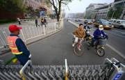 2014年4月2日,北京長安街上多個路口增設(shè)了封機動車護(hù)欄,紅燈時非機動車護(hù)欄拉起,防止非機動車闖紅燈。圖為綠燈亮起,護(hù)欄打開正常通行。