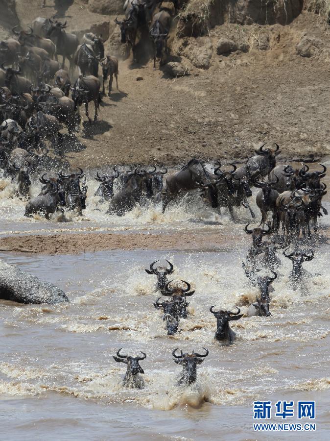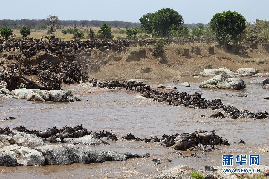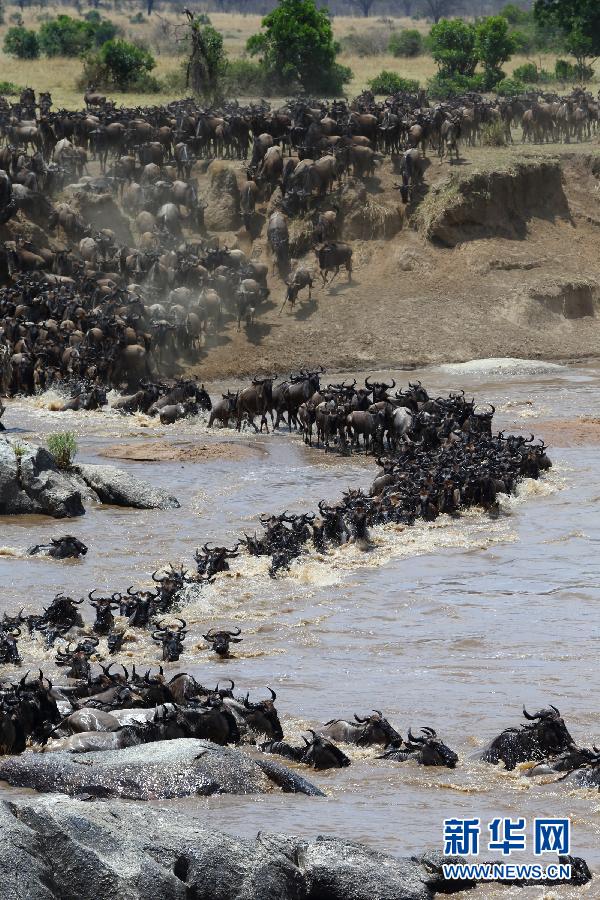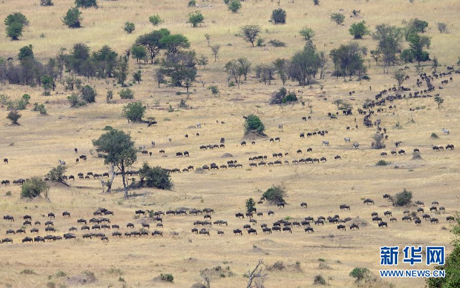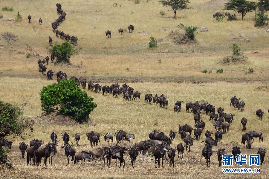 這是8月17日在坦桑尼亞塞倫蓋蒂國家公園內(nèi)拍攝的角馬遷徙隊(duì)伍。每年7月至9月是坦桑尼亞的旱季,為了追逐水源和青草,以角馬和斑馬為主的數(shù)以百萬計的食草動物從塞倫蓋蒂向肯尼亞馬賽馬拉遷徙。這場“地球上最壯觀的動物大遷徙”全程超過1000公里,動物在往返途中需兩次渡過鱷魚出沒、危機(jī)重重的馬拉河。新華社記者張平攝