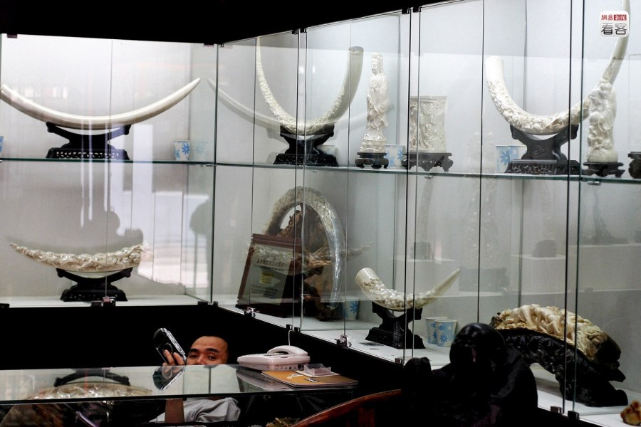 中國(guó)對(duì)象牙市場(chǎng)采用收藏證和特許經(jīng)銷制度,象牙制品一對(duì)一配有國(guó)家林業(yè)局頒發(fā)的收藏證。但中國(guó)一半以上的合法象牙加工銷售企業(yè)牽涉非法貿(mào)易,將走私象牙“洗白”。圖為2010年6月30日,杭州,一名收藏愛(ài)好者在西泠春拍預(yù)展上查看一件象牙工藝品。CFP