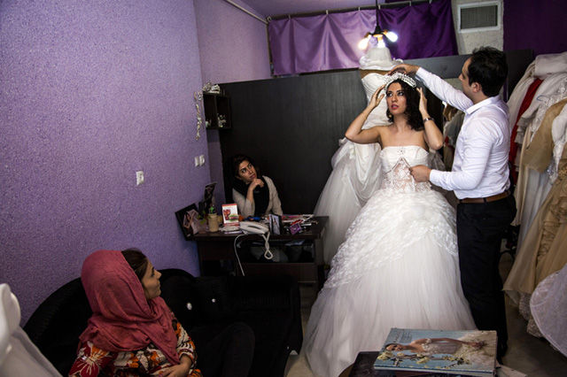 在一個(gè)婚紗店里,一名男性在幫一名女性調(diào)整頭飾。一名不相關(guān)的男性和女性在這種情況下是被禁止呆在一起的,這件裙子擺放在店內(nèi)的某個(gè)角落,從大街上是看不到的。