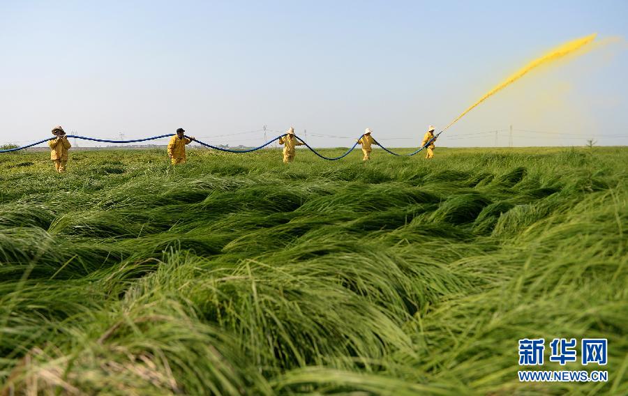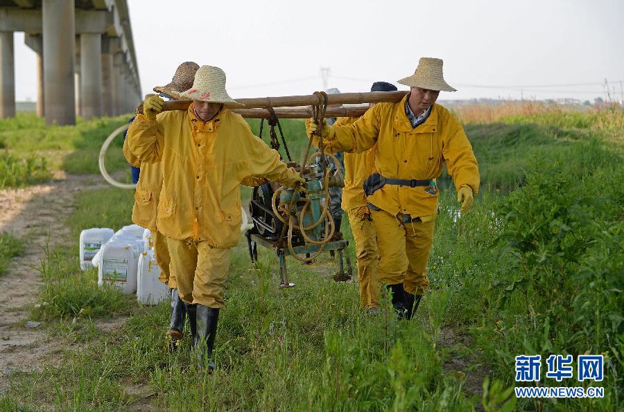 滅螺隊(duì)隊(duì)員扛著150米的皮管對(duì)重點(diǎn)地區(qū)進(jìn)行藥物滅螺(4月14日攝)。