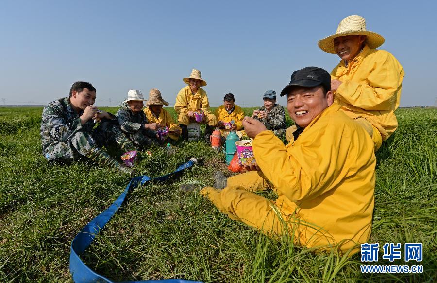 滅螺隊(duì)員在草洲上吃自帶的方便面和干糧(4月14日攝)。 新華社記者 萬(wàn)象 攝