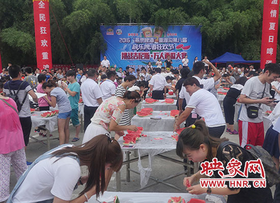 “挑戰(zhàn)吉尼斯 萬人吃西瓜”是由欒川重渡溝風景區(qū)和鄭州支點旅游品牌策劃有限公司聯(lián)合打造的2016“燕京啤酒”重渡溝第八屆音樂啤酒狂歡節(jié)狂歡不停歇第三期主題活動。當日重渡溝景區(qū)熱鬧非凡,擺滿誘人西瓜的小方桌次第擺開,翠綠的皮、鮮紅的瓤、瓜香四溢。游客們熱情參與,現(xiàn)場妙趣橫生。有“推土機”式掃蕩吃法,有“生猛”地大口吞咽,有小朋友萌態(tài)啃瓜表情十足......真是吃得爽快,玩得暢快,贏得痛快。比賽分為“狼吞虎咽”男子組、“大快朵頤”女子組,每組冠軍將獲得3000元現(xiàn)金大獎。經(jīng)過淘汰賽、決賽層層激烈角逐,最終比賽決出男女子組一、二、三等獎各一名,所有參賽選手都乘興而來,滿載而歸!“來重渡溝吃西瓜感覺特別甜,特別痛快!從來沒有跟這么多人一起吃西瓜,一口氣連吃三塊還不過癮!”一位游客笑著對記者說。