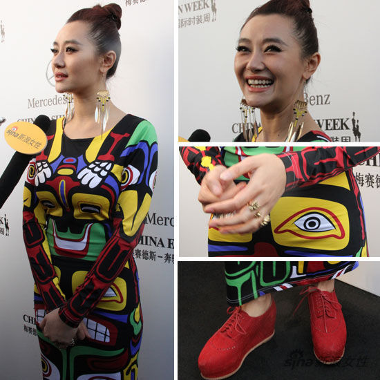 中國國際時(shí)裝周啟動(dòng)儀式,愛戴一襲民族風(fēng)緊身長裙秀纖細(xì)小蠻腰,搭配了大紅色的休閑鞋,梳起了俏皮的丸子頭,在配上流蘇項(xiàng)鏈和金屬朋克風(fēng)的戒指首飾,整身表達(dá)了周末輕松愉悅的心情,同時(shí)花花綠綠的出街,又很吸引人眼球。