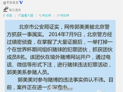 2014年7月10日,據(jù)法制晚報(bào)播報(bào):據(jù)線(xiàn)報(bào),郭美美因賭球被北京警方抓了!