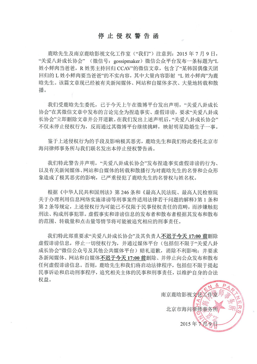 7月9日,關(guān)于“關(guān)愛(ài)八卦成長(zhǎng)協(xié)會(huì)”微信公眾號(hào)發(fā)布“L姓小鮮肉當(dāng)爸爸”一文,影射鹿晗先生一事,鹿晗工作室發(fā)律師函否認(rèn)并警告其造謠生事,稱:“我們受鹿晗先生委托,已于今天上午在微博平臺(tái)發(fā)出聲明,“關(guān)愛(ài)八卦成長(zhǎng)協(xié)會(huì)”在其微信文章中發(fā)布的言論完全為捏造誹謗,要求‘關(guān)愛(ài)八卦成長(zhǎng)協(xié)會(huì)’立即刪除文章并公開道歉。在我們發(fā)出上述聲明后,‘關(guān)愛(ài)八卦成長(zhǎng)協(xié)會(huì)’不僅未停止侵權(quán)行為,反而通過(guò)其微博平臺(tái)繼續(xù)挑釁,映射明星隱婚生子一事,鑒于行為惡劣,發(fā)出警告函?!?/p>