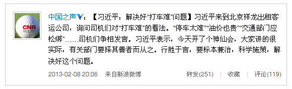 【習近平:解決好“打車難”問題】習近平來到北京祥龍出租客運公司,詢問司機們對“打車難”的看法?!巴\囂y”“油價也貴”“交通部門應松綁”……司機們爭相發(fā)言。習近平表示,今天開了個神仙會,大家講的很實際,有關部門要擇其善者而從之。行勝于言,要標本兼治,科學施策,解決好這個問題。
