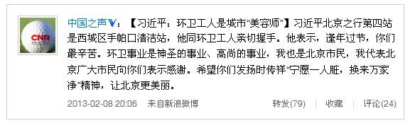 他表示,逢年過節(jié),你們最辛苦。環(huán)衛(wèi)事業(yè)是神圣事業(yè)、高尚事業(yè),我也是北京市民,我代表北京廣大市民向你們表示感謝。希望你們發(fā)揚時傳祥“寧愿一人臟,換來萬家凈”精神,讓北京更美麗。
