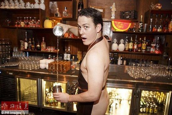 餐廳里的服務(wù)員們都只穿著裸色的內(nèi)褲,并在腰上圍著樹葉??瓷先ズ苡泄畔ED風(fēng)格。