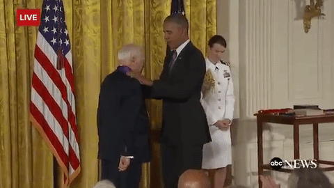 據(jù)報(bào)道,老藝術(shù)家Mel Brooks今天進(jìn)白宮接受“National Medal of Arts”,奧巴馬往他脖子上掛獎(jiǎng)?wù)碌臅r(shí)候,這個(gè)90歲的老頑童做勢(shì)要脫奧巴馬的褲子,給總統(tǒng)嚇了一趔趄。