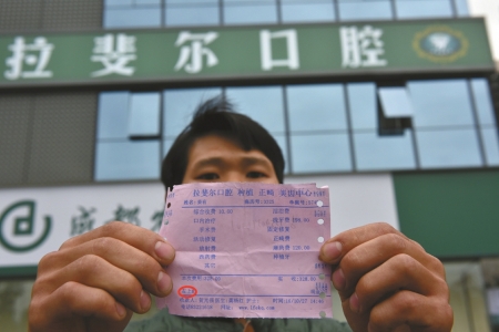 26歲的小姜在成都工作,住在姐姐家。一顆緊靠盡頭牙的左下牙把小姜折磨了近一年,平日他只是弄點(diǎn)含片“對(duì)付對(duì)付”。10月27日,小姜終于決定“來(lái)個(gè)徹底根治”。當(dāng)天下午1點(diǎn)過(guò),他問(wèn)姐姐要了300塊錢后,來(lái)到位于高新區(qū)府城大道的拉斐爾口腔醫(yī)院。