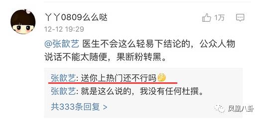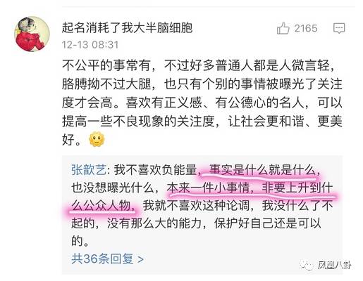 至于張歆藝在評論中說的別把我當公眾人物,小妹(鳳凰八卦微信號:entifengvip)也不能茍同,從事演員這份職業(yè),微博粉絲過千萬,在享受公眾人物的便利時(小妹(鳳凰八卦微信號:entifengvip)就做不到拿別人的名字掛號),是不是也應(yīng)該承擔起公眾人物的社會責任呢?