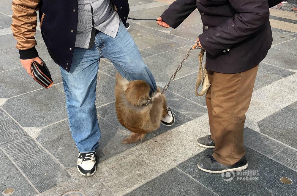 2016年12月11日,在合肥一公園門(mén)口,有幾只猴子在主人的指令下,緊緊抱住行人的腿部,幫主人討要1元“擁抱費(fèi)”,如對(duì)方不給則緊抱不放。馬方/視覺(jué)中國(guó)