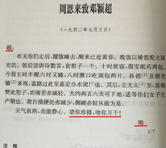 最近,新浪博主@倩兮HMing 送上了這把跨越數(shù)十年的,來自中央的高級(jí)狗糧:1942至1955年,9封周恩來與鄧穎超的往來書信。據(jù)觀察者網(wǎng)查詢,這些書信都出自《周恩來鄧穎超通信選集》,這本選集由中共中央文獻(xiàn)研究室編撰,1998年2月出版,全書約10萬字。
