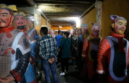 兵馬俑彩繪工藝復(fù)雜、上色講究,但是在這個八大奇跡館里面,兵馬俑模型統(tǒng)統(tǒng)被化成了“雙眼皮、紅嘴唇”。