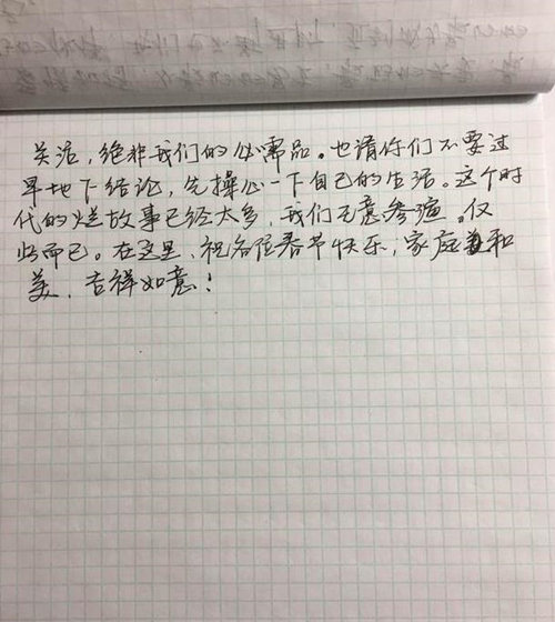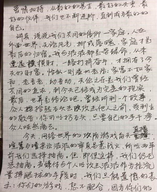 網(wǎng)易娛樂(lè)1月26日?qǐng)?bào)道 日前,演員周立波在美國(guó)長(zhǎng)島因涉嫌持有槍支、藏有毒品而被美國(guó)警方逮捕,在繳納保釋金后獲得保釋。此前周立波先是在美國(guó)通過(guò)媒體表示“持有的槍支合法,毒品并非其所有。之后還曾發(fā)微博自證“事實(shí)和法律將還我清白”。而就在1月26日早上,周立波妻子胡潔通過(guò)微博發(fā)布自己的一封手寫信,力贊丈夫周立波“完美”。對(duì)于近日的是非,她更表示“請(qǐng)不要過(guò)早下結(jié)論,先操心自己的生活”。