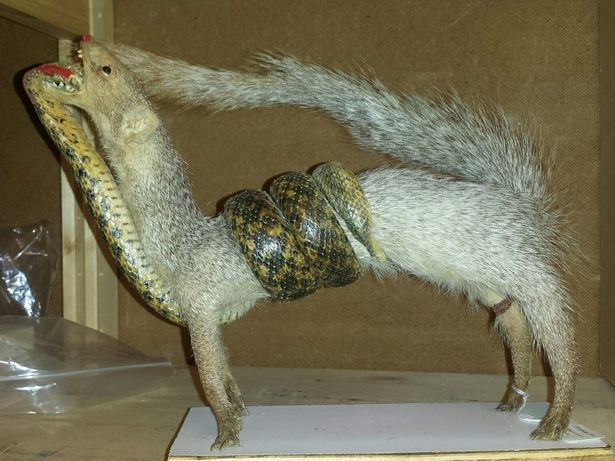 近日,社交媒體上瘋傳一組讓人看了惡夢連連的博物館展覽照,照片中有有恐怖的玩偶、繪畫作品和怪異的模型等。作品之一是,一條蛇和貓鼬緊緊纏在一起,表現(xiàn)的是蛇和貓鼬生死斗爭的最后時(shí)刻,最終貓鼬半吞蛇以示勝利。