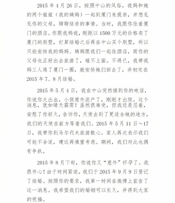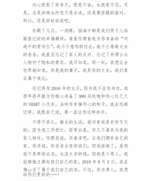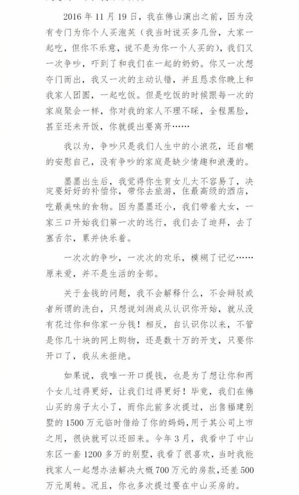 搜狐娛樂訊 5月23日凌晨,劉洲成發(fā)微博回應(yīng)家暴致前妻林苗流產(chǎn)及要求前妻出錢買房等傳聞。劉洲成在文中以時間為緯度講述他與前妻相識相愛到結(jié)婚的過程,還列舉出前妻從懷孕到流產(chǎn)的事例,劉洲成在文中還稱“從認(rèn)識你開始,就從沒花過你和你家一分錢”。此外,劉洲成更是曬出了昔日的聊天記錄、代付清單、借記卡賬戶歷史明細(xì)清單等證據(jù),疑似反駁前妻所述不實。