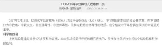 據(jù)中國(guó)經(jīng)濟(jì)網(wǎng)記者了解,今年3月15日,歐洲化學(xué)品管理局(ECHA)風(fēng)險(xiǎn)評(píng)估委員會(huì)(RAC)也正式確認(rèn)了確認(rèn)草甘膦為非致癌物。