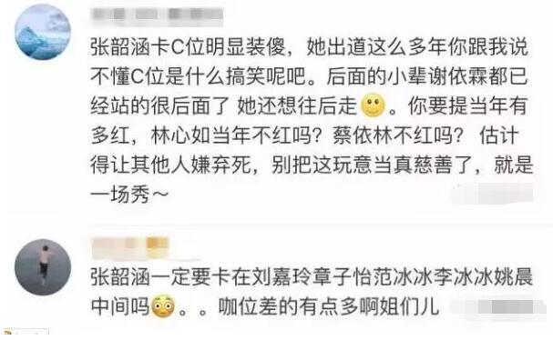 粉絲也在為她解釋:“誰(shuí)稀罕C位?而且張韶涵也是莫名其妙被擠到中間的~況且人家當(dāng)年還是小天后級(jí)別呢?!?/p>