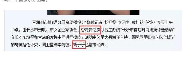 此外,另一篇來自三湘都市報,題為《張柏芝當評委現身長沙至潮五星辣媽揭曉》的報道也提到,在長沙市婦聯(lián)、市女企業(yè)家協(xié)會、香港貴之步聯(lián)合主辦的“長沙市首屆時尚潮媽評選活動”中,楊樂樂亦出席。