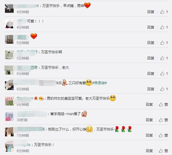 網(wǎng)友也紛紛評論說:“男的帥女的美寶寶可愛。老大萬圣節(jié)快樂”、“老大千鈺姐萬圣節(jié)快樂?。。∥以趯懽鳂I(yè)里贏來了萬圣節(jié)orz……老大晚上早點睡呀,雖然可能會有很多小孩子來敲門說“不給糖就搗蛋”吧,hhhhhhh”