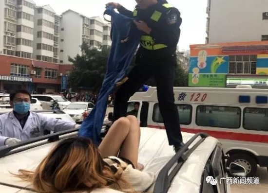 據(jù)來賓市公安局城警支隊東盟警務(wù)站覃警官介紹,當(dāng)天上午8時20分左右,他們接到群眾報警后趕到現(xiàn)場,看到一名年輕女子躺在一輛面包車頂上,嘴唇出血,腰部有血跡。