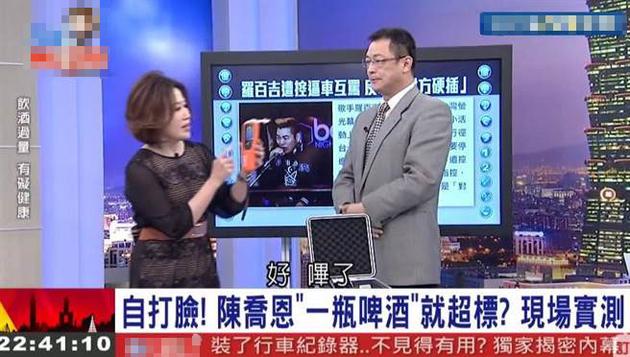 該警官在節(jié)目現(xiàn)場喝啤酒實測,首先喝完一罐330ml的啤酒,測得酒測值為0.08,接著喝完第2罐啤酒,酒測值也只到0.16,與陳喬恩所謂的一罐啤酒飆至0.67的數(shù)字相差甚遠,也讓主持人驚呼:“所以陳喬恩就在說謊嘛!”