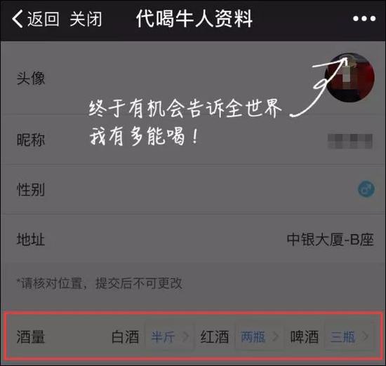 用戶在軟件中輸入或設(shè)置自己的位置,手機畫面的地圖上就會顯示出附近的 “代喝人”。這些“代喝人”在提供“代喝”服務(wù)之前,會提前在軟件上的個人信息中寫明自己的酒量、喜歡的酒類以及性別等基本信息。無論是誰都可以成為代喝人。