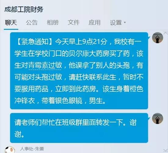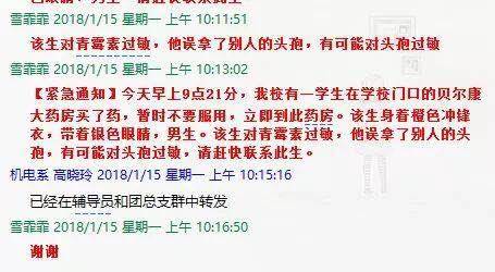發(fā)布的消息內(nèi)容為:“【緊急通知】今早上9點(diǎn)21分,我校有一學(xué)生在學(xué)校門口的貝爾康大藥房買了藥,該生對(duì)青霉素過(guò)敏,他誤拿了別人的頭孢,有可能對(duì)頭孢過(guò)敏,請(qǐng)趕快聯(lián)系此生,暫時(shí)不要服用藥品,立即到此藥房。該生身著橙色沖鋒衣,戴銀色眼鏡,男生。”