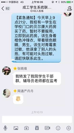 隨即,一場(chǎng)全校上下師生全員大尋找的緊急尋人隨即展開。校方在學(xué)校各個(gè)平臺(tái)及所有輔導(dǎo)員群將該消息發(fā)布出去,同時(shí)通過(guò)短信平臺(tái)向所有在校學(xué)生群發(fā)短信,希望找到該名拿錯(cuò)藥的學(xué)生。