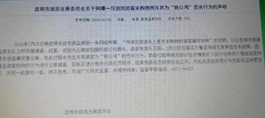 近日,網(wǎng)傳云南一導(dǎo)游斥未購(gòu)物游客為“鐵公雞”,引發(fā)關(guān)注。昆明市旅發(fā)委稱,2018年1月25日晚昆明市旅發(fā)委監(jiān)測(cè)到一條網(wǎng)絡(luò)輿情,“導(dǎo)游在旅游車上要求未購(gòu)物的游客填寫說(shuō)明”的視頻,26日昆明市旅游監(jiān)察支隊(duì)立即開(kāi)展調(diào)查。